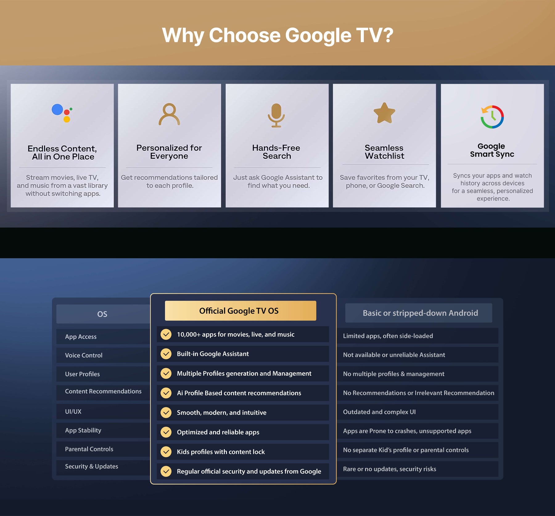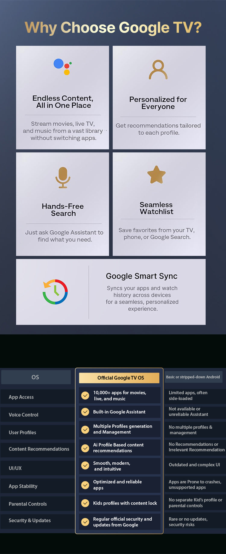Wireless: Dual-band Wi-Fi 6 (2.4G & 5G), Wireless Screen Mirroring, built in Chromecast